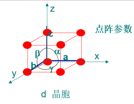 每个晶格的三条棱和三个夹角叫做晶格的晶格(点阵)常数,并以此刻画晶胞(或者是晶格)的大小和形状特点,如下图所示,描述平行六面体的大小,形状可用六个参数表示,a、b、c—三条互不平行的棱,晶轴夹角:α、β、γ——棱间夹角。
