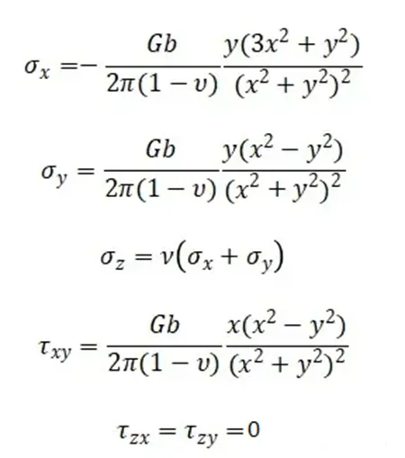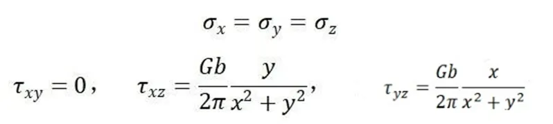 由上面的结果可知,螺位错的应力场没有正应力分量,且剪应力对称分布,在包含位错线的任何晶向平面上剪应力都是Gb/2πr,与θ角无关。螺位错不引起晶体的膨胀或收缩。