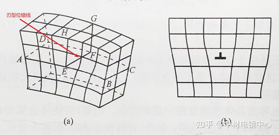设含位错的晶体为简单立方晶体,在其晶面ABCD上半部存在多余的半排原子面EFGH,这个半原子面中断于ABCD面上的EF处,它好像一把刀刃插入晶体中,使ABCD面上下部分晶体之间产生了原子错排,故称为“刃型位错”,多余的半原子面与滑移面的交线EF就称作刃型位错线。