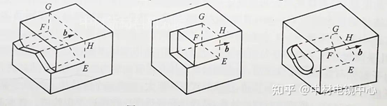 刃型位错线可理解为晶体中已滑移区与未滑移区的边界线。它不一定是直线,也可以是折线或曲线,但它必与滑移方向相垂直,也垂直于滑移矢量,如下图所示: