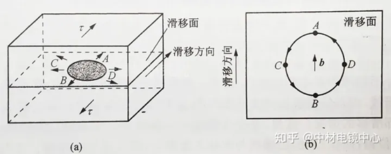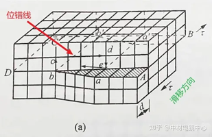 设立方晶体右侧受到切应力τ的作用,其右侧上下两部分晶体沿滑移面ABCD发生了错动,如图a所示: