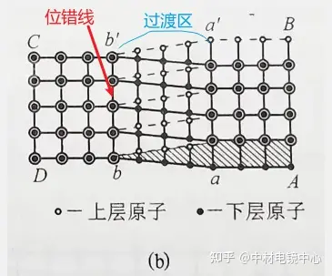 可以看出,在aa’右边晶体的上下层原子相对错动了一个原子间距,而在bb’和aa’之间出现了一个约有几个原子间距宽的、上下层原子位置不相吻合的过渡区,这里原子的正常排列遭到破坏。