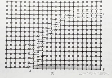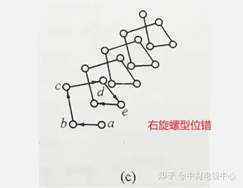 如果以位错线bb’为轴线,从a开始,按顺时针方向依次连接此过渡区的各原子,则其走向与一个右螺旋线的前进方向一样(见图c)。